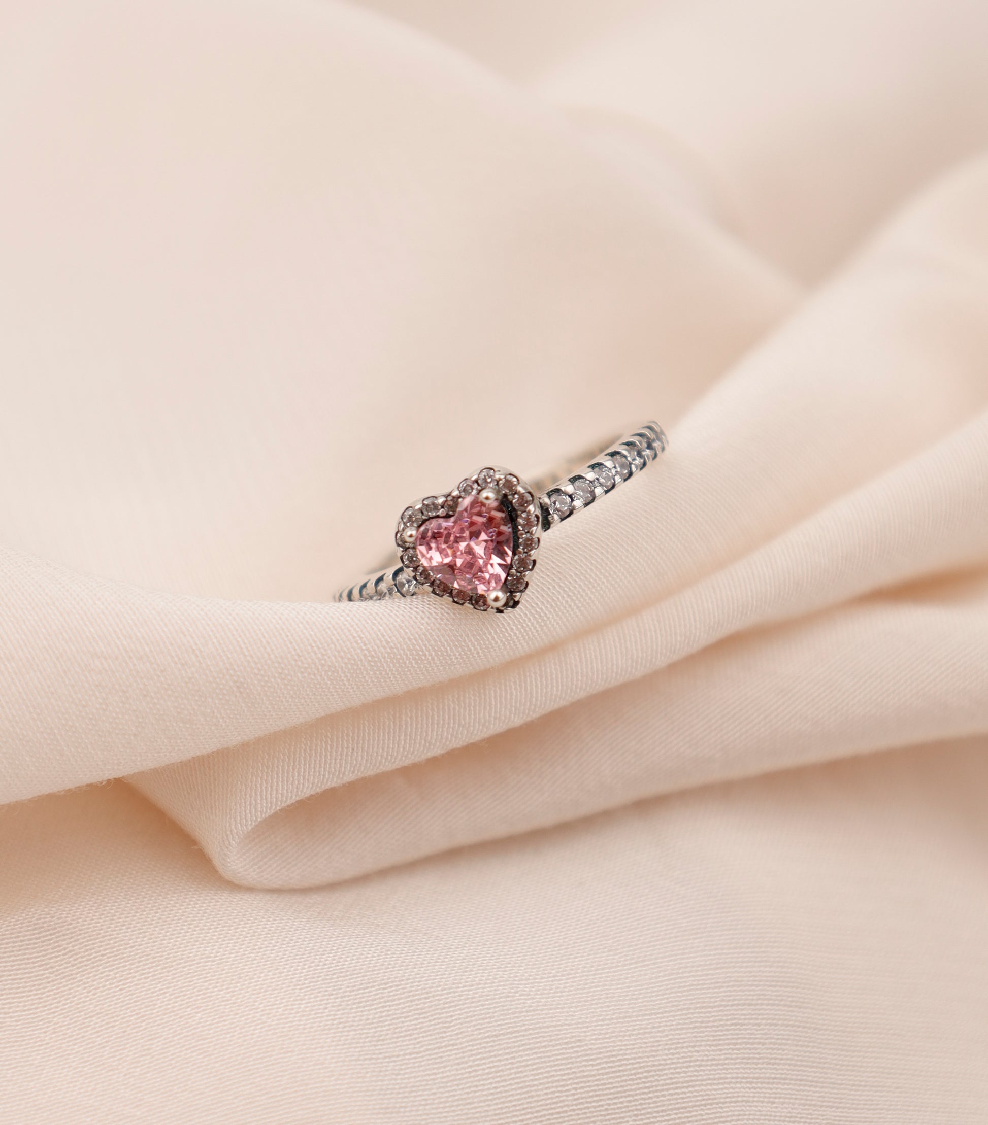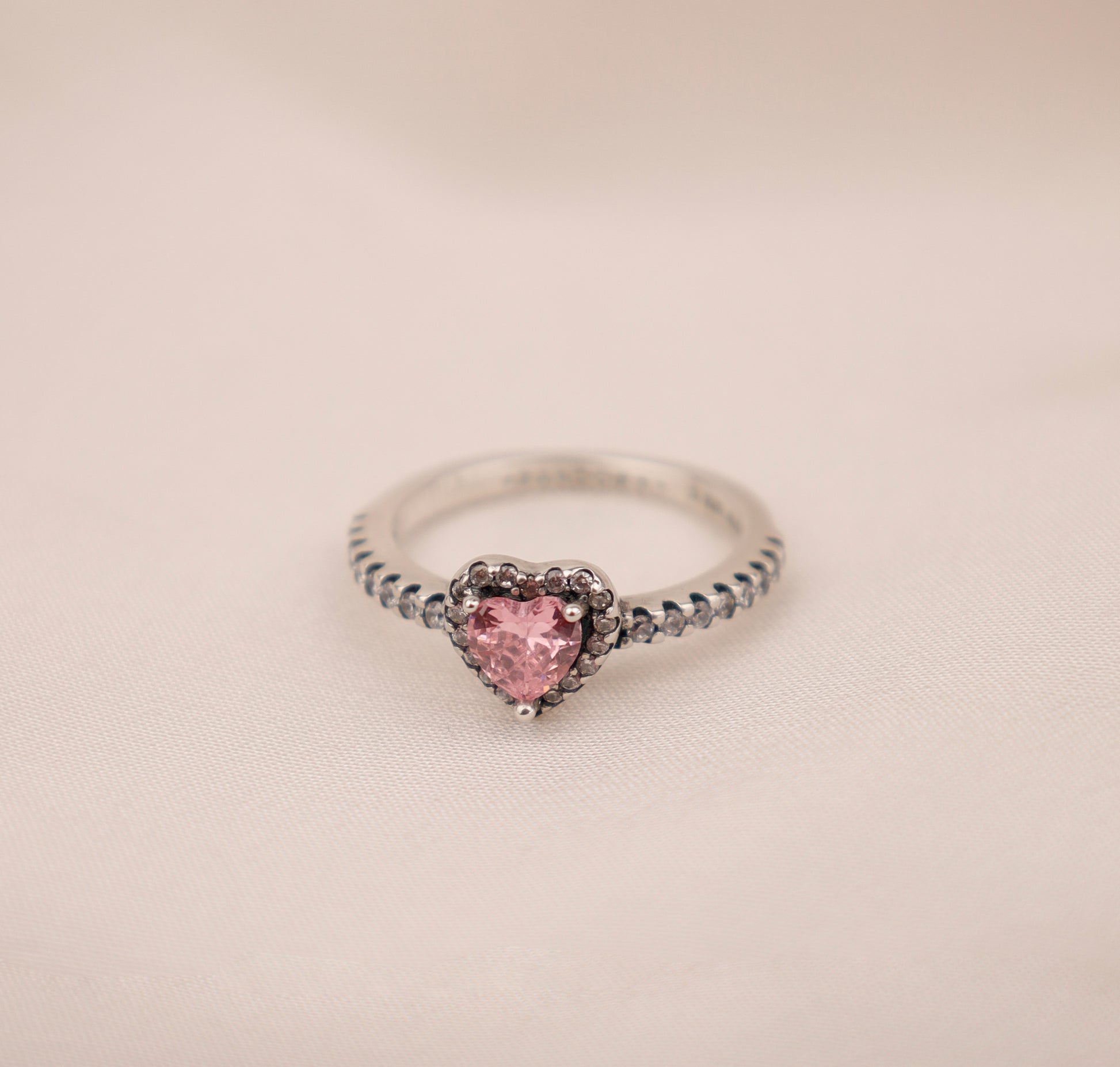 Anillo en plata con piedra en circonita grande en forma de corazón de color rosa.