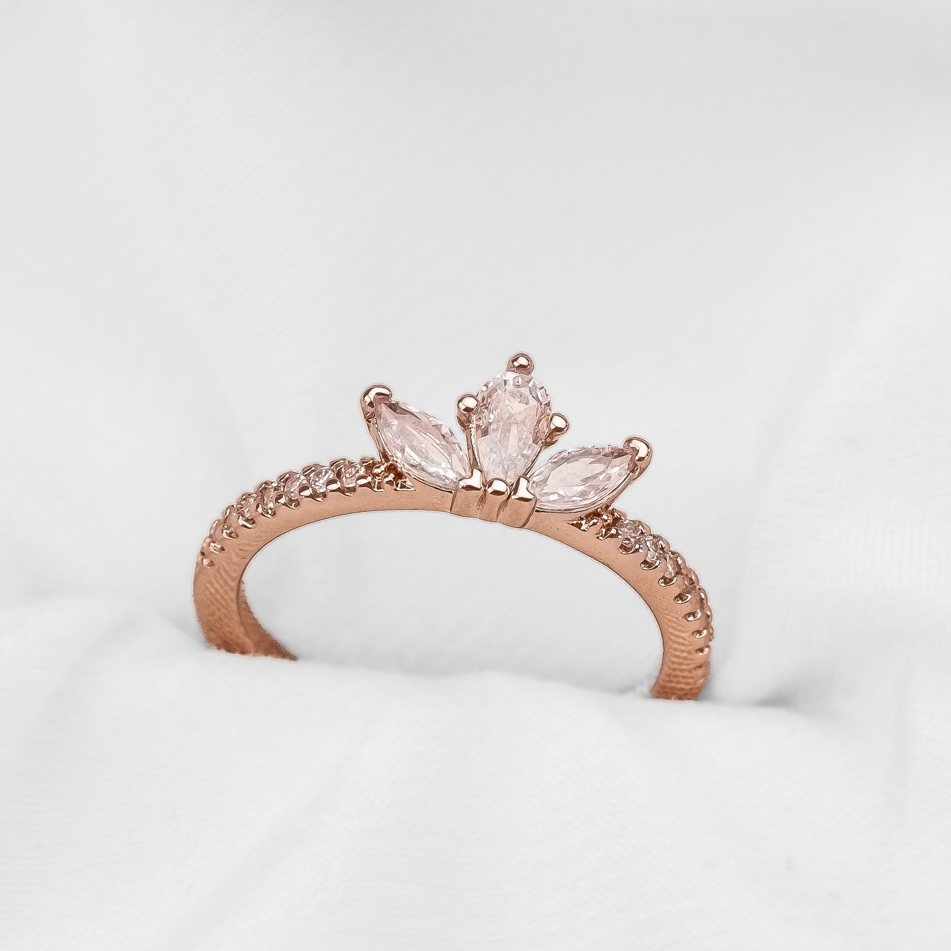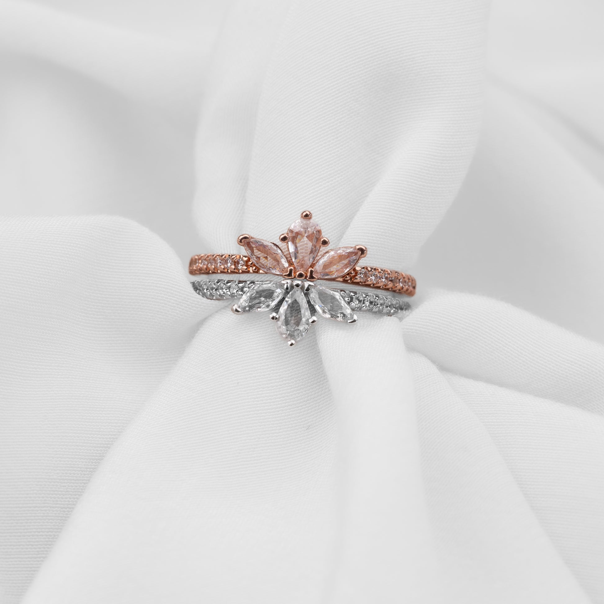 Un anillo que florece en tu dedo. Su diseño floral, con pétalos de circonitas cúbicas que se abren con delicadeza, evoca la belleza de la naturaleza. La combinación de oro rosa y plata le otorga un toque romántico y femenino. (son dos anillos)