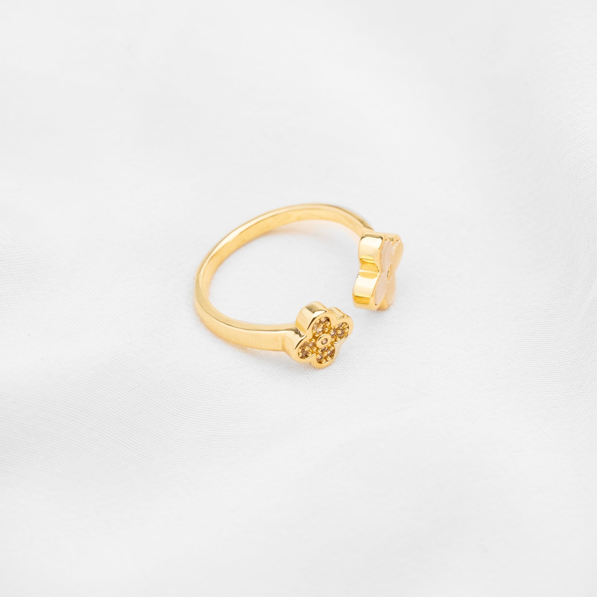 Anillo en baño de oro con dos tréboles, uno de ellos tiene uno en color nácar blanco y el otro con circonitas