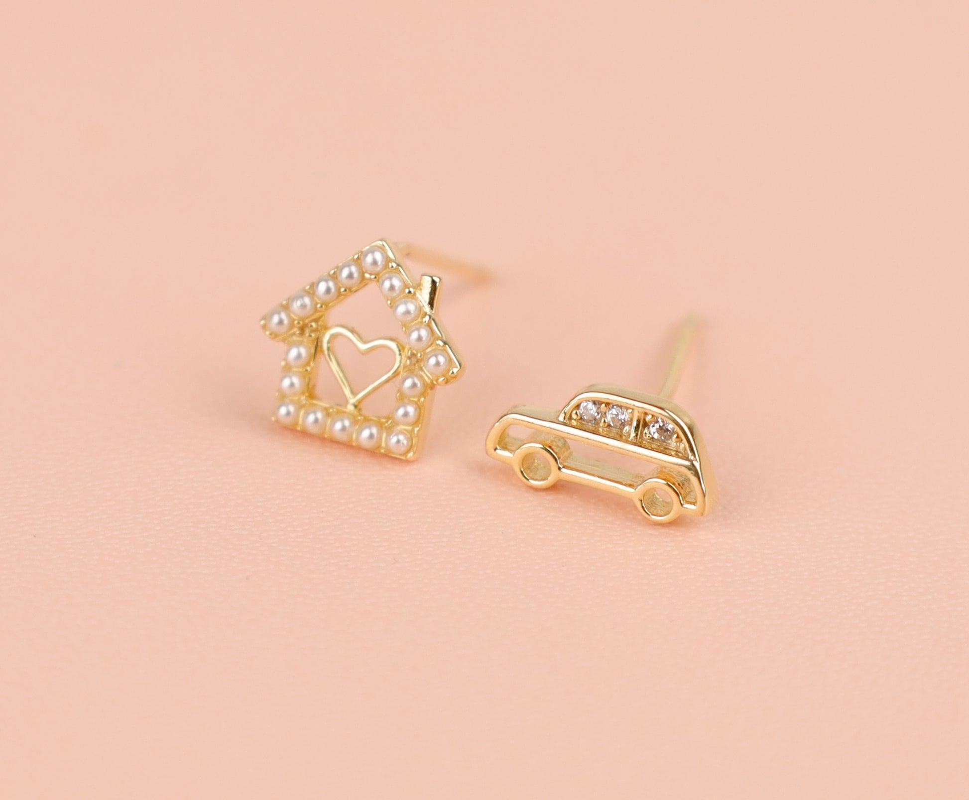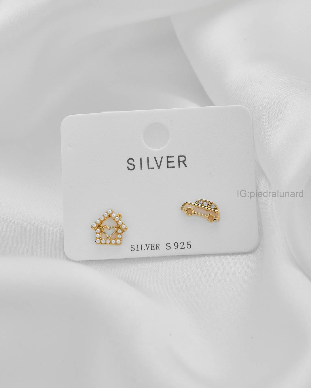 Aretes en plata 925 con baño de oro, hipoalergénicos, casa en perlas y carro en oro