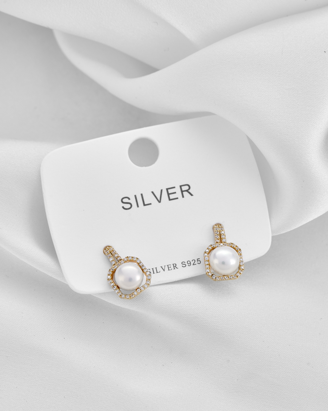 Aretes en plata 925 con baño de oro, hipoalergénicos, presenta un cuadrado en circonitas y una gran perla