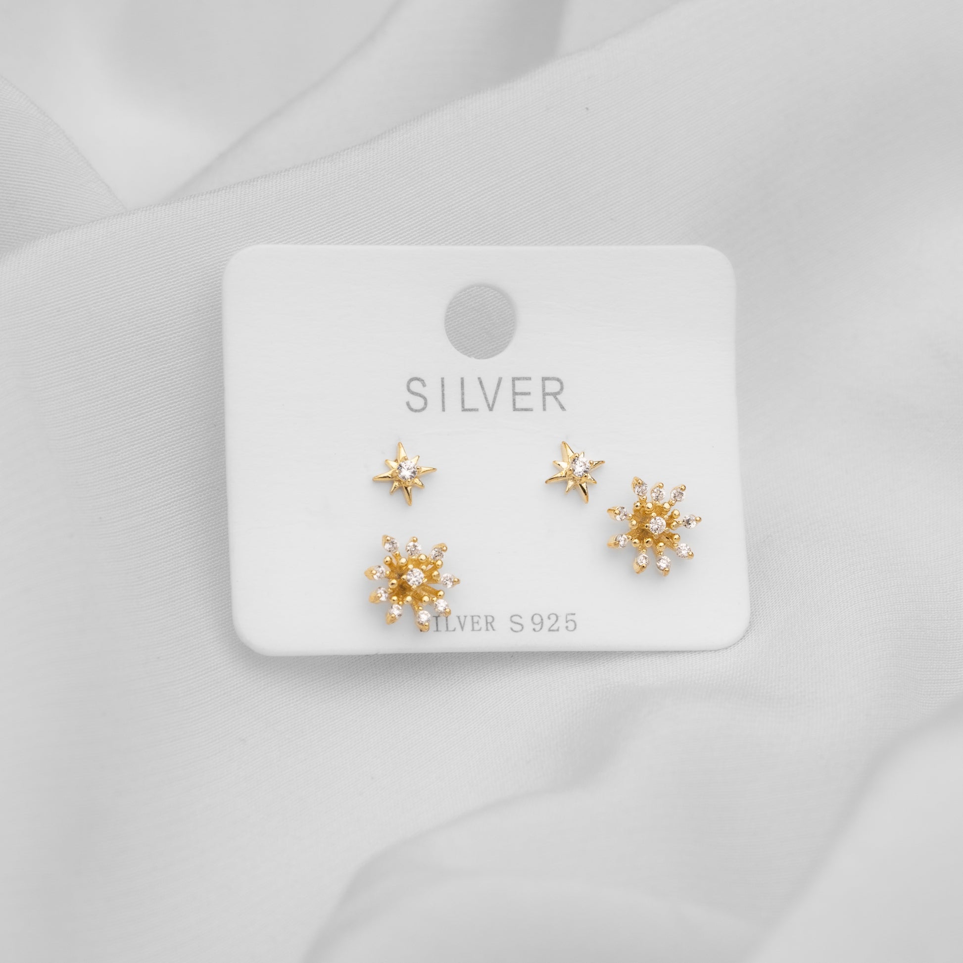 Aretes en Plata Esterlina 925 que muestra un par en forma forma de delicadas estrellas, mientras que el otro par se asemeja a copos de nieve intrincados con pequeñas piedras incrustadas en ellos.