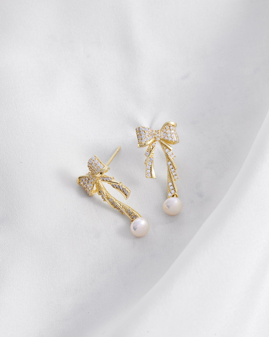 Aretes en plata con baño de oro, hipoalergénico; moño en circonitas y perla.