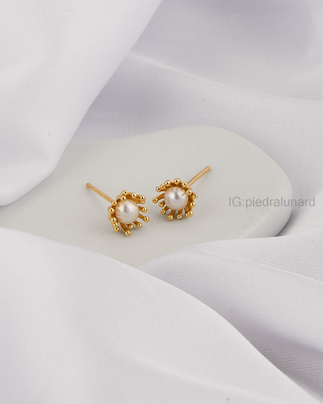 Aretes topos en plata 925 con baño de oro, hipoalergénicos, en forma de flor y perla en el centro.
