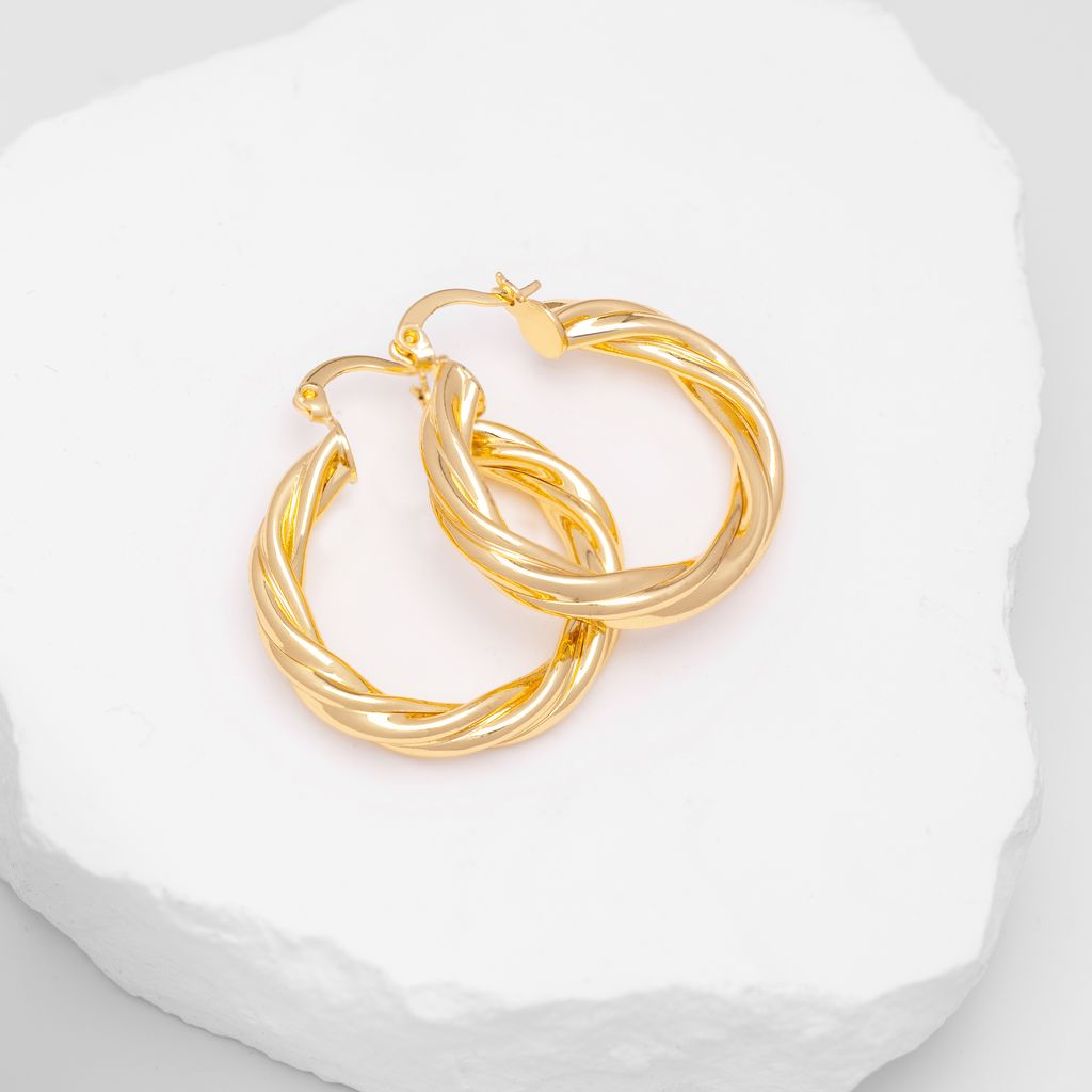 Argollas medianas con diseño trenzado en tono dorado. Ligeras, elegantes y perfectas para elevar cualquier look.
