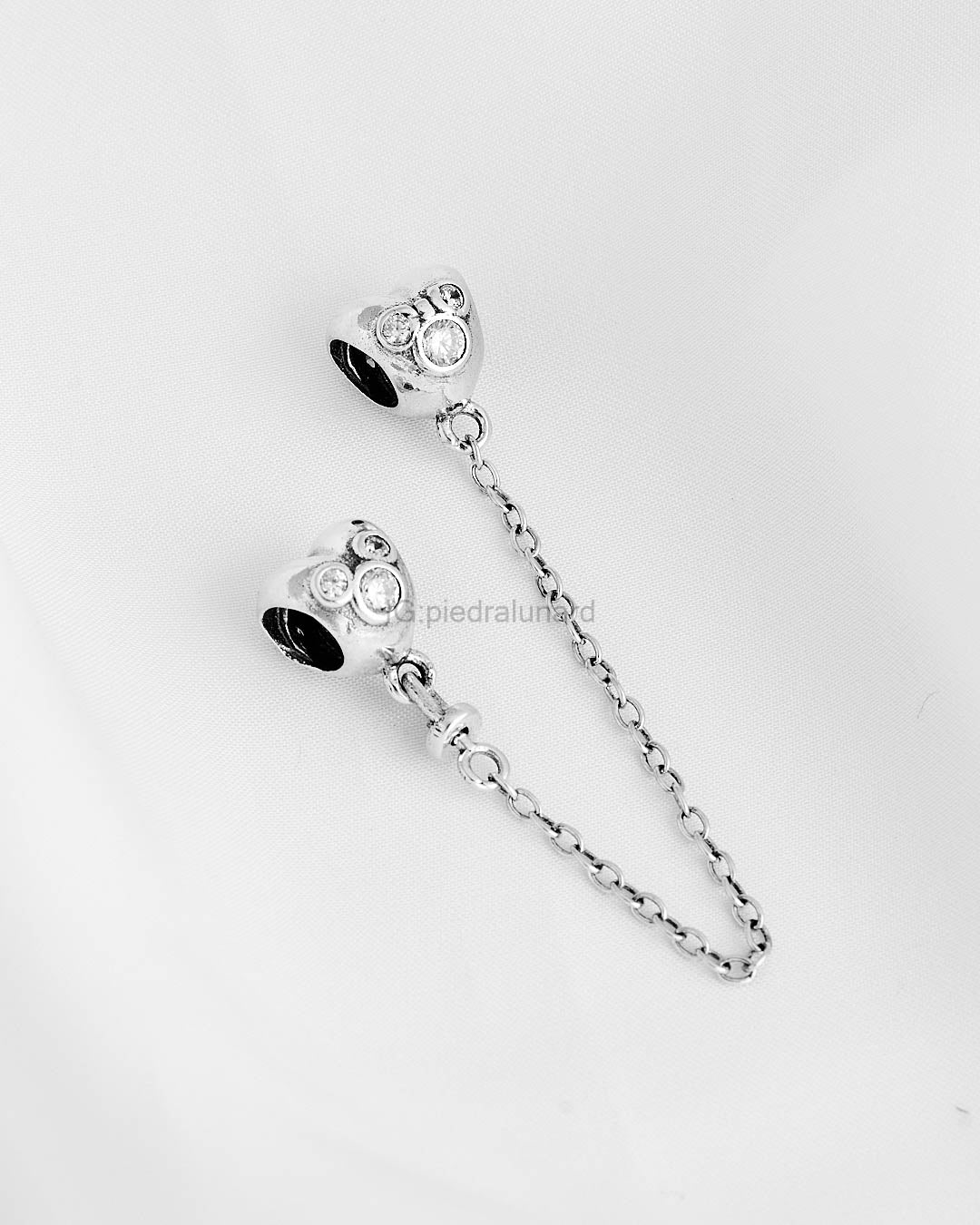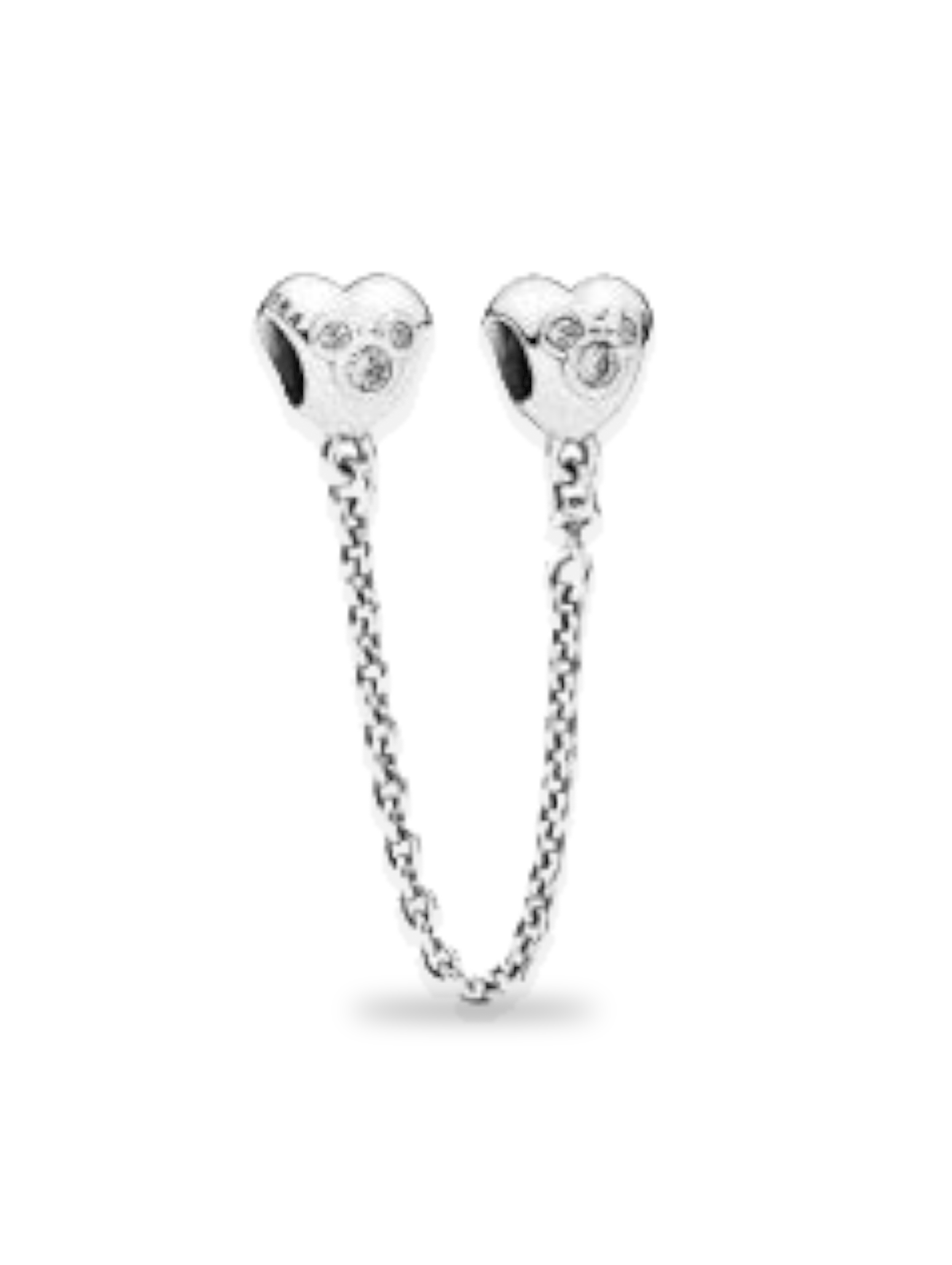 Seguro en plata 925 con terminales decorados con delicados corazones en relieve. Un accesorio funcional y romántico que protege tu pulsera con estilo.