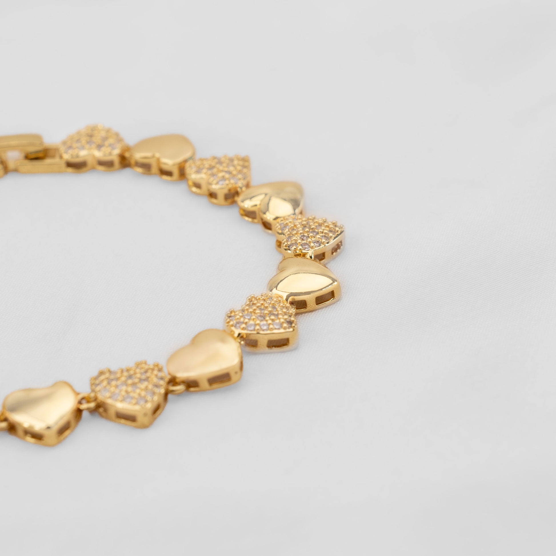Pulsera con Corazones y Circonitas en oro laminado. Sirve para talla 17,18,19 cm