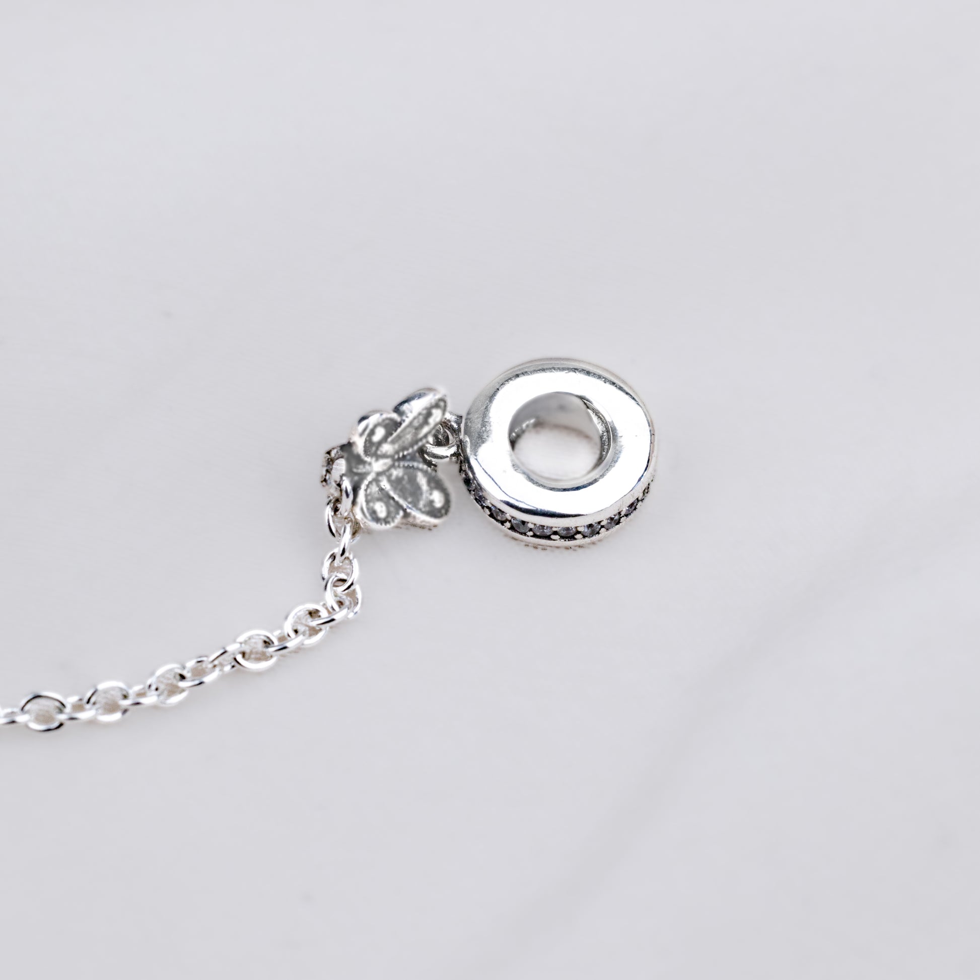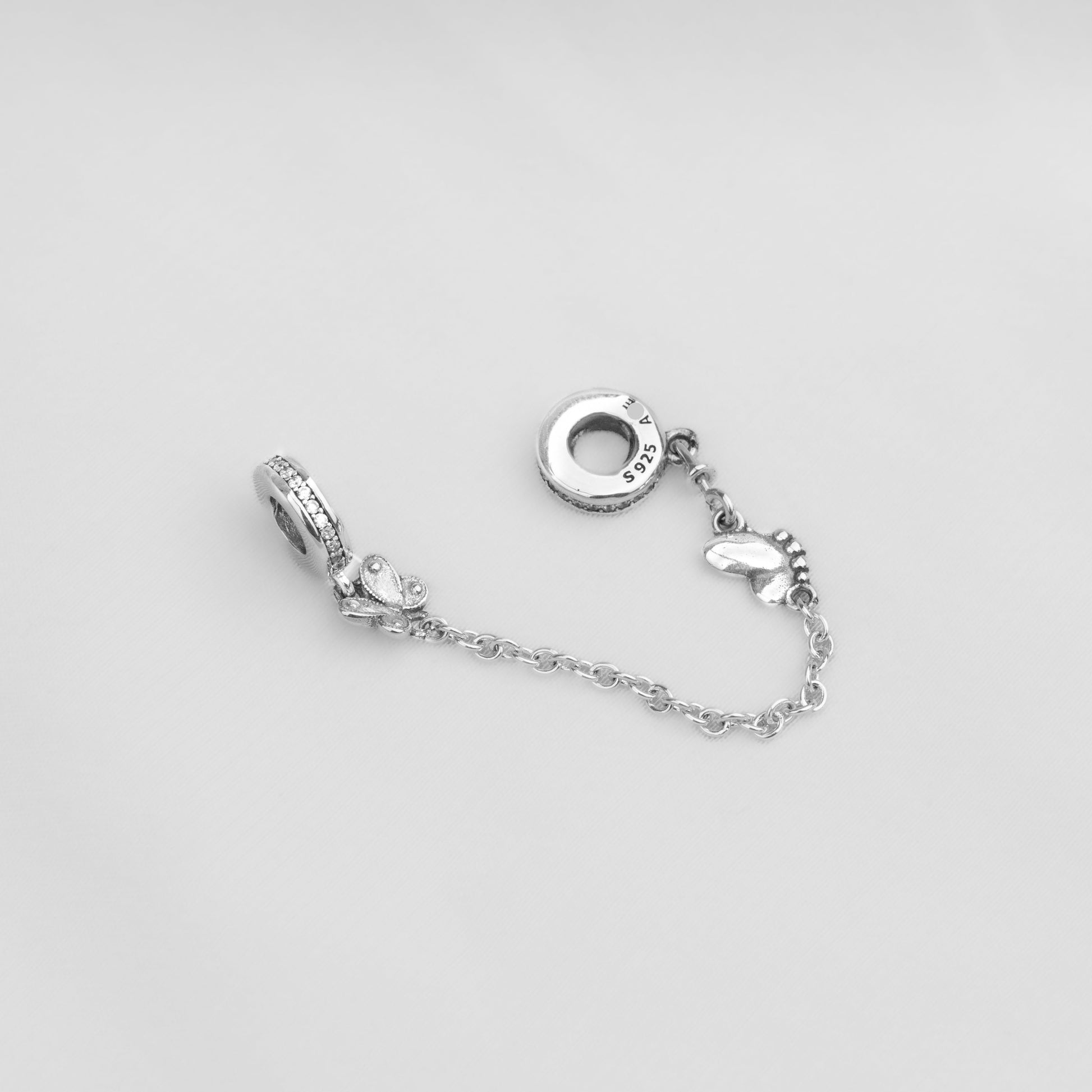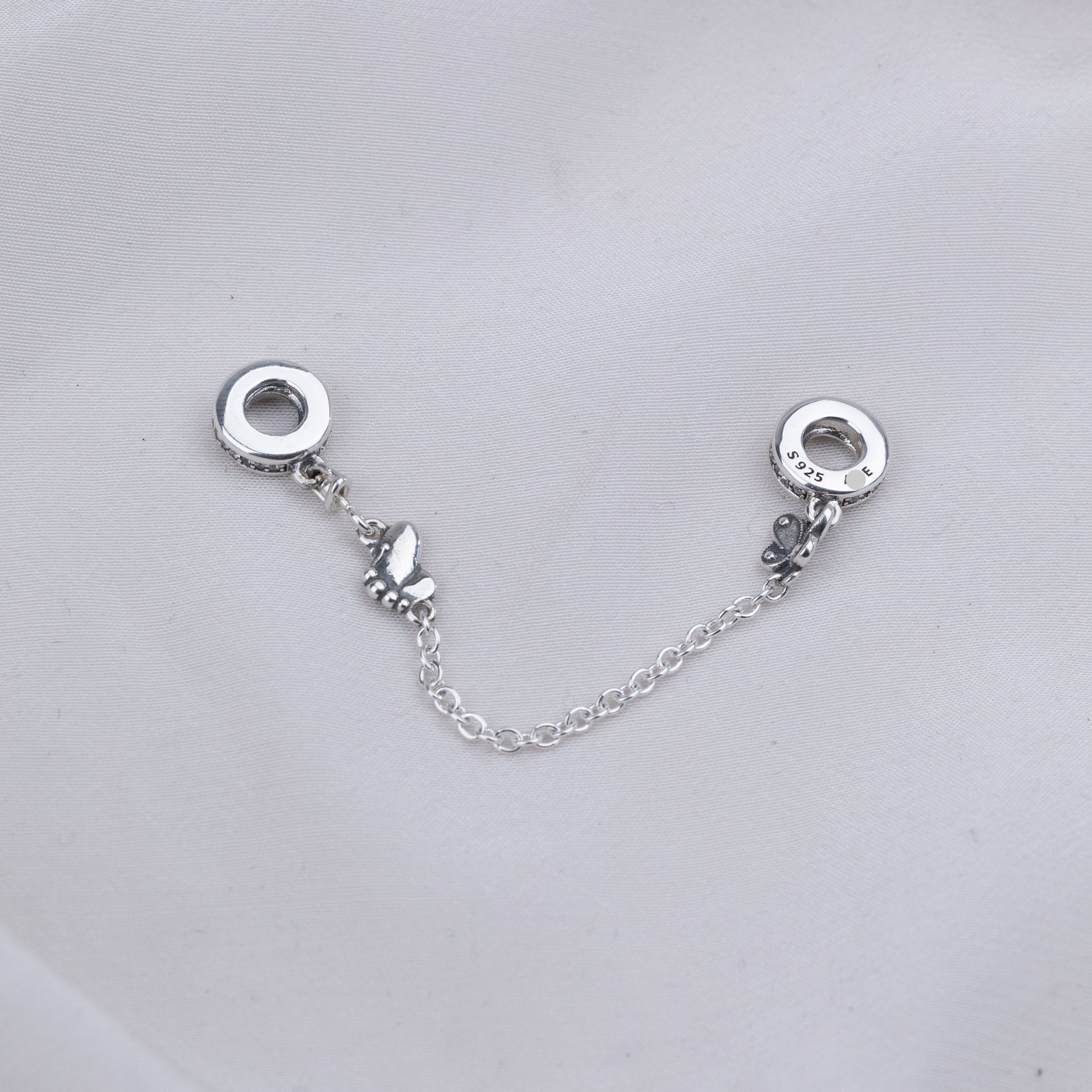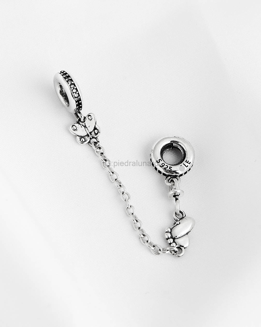 Elaborada en plata 925 con extremos decorados con mariposas detalladas y aro adornado con circonitas. Diseñada para proteger dijes y evitar caídas accidentales.