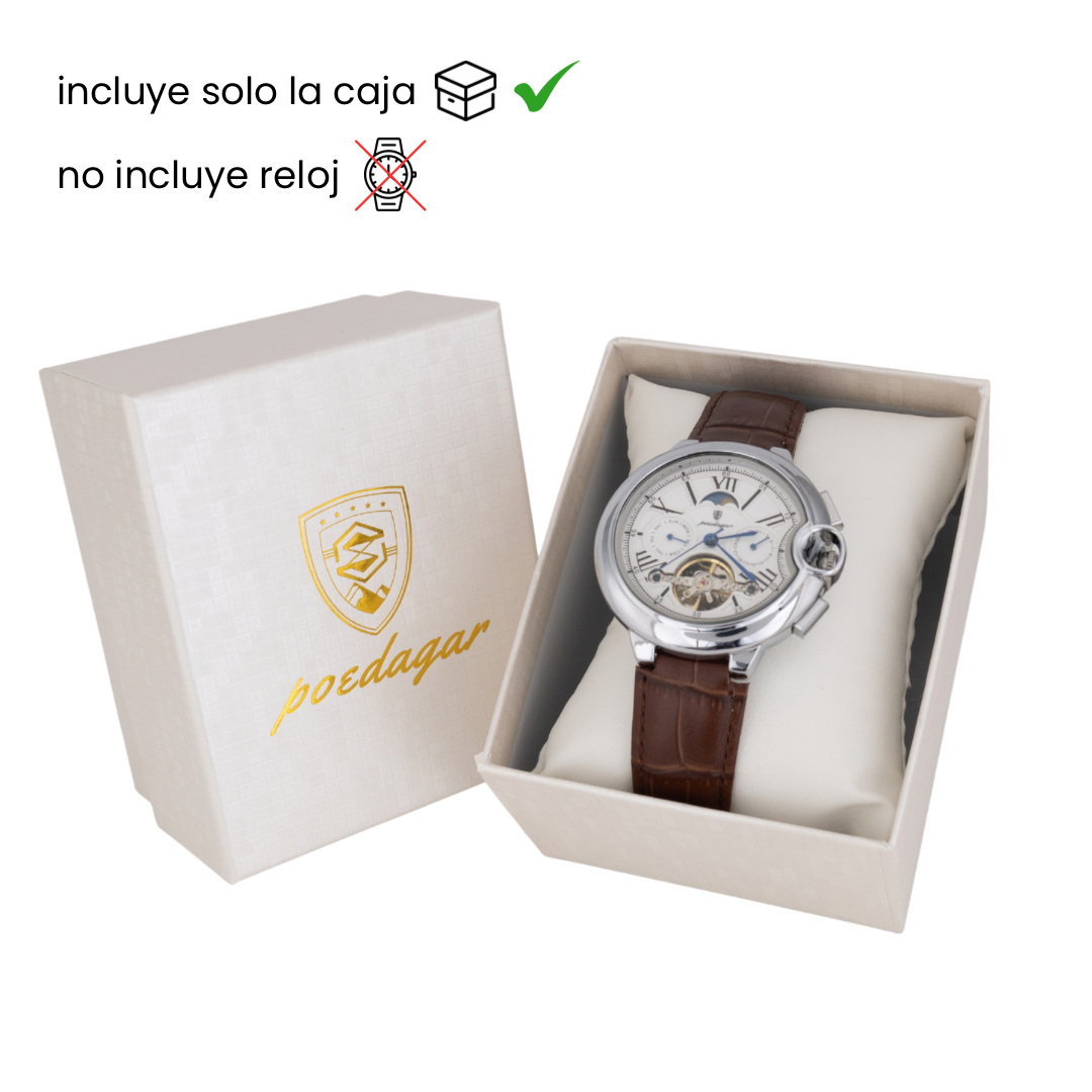 Caja original Poedagar de presentación elegante, diseñada para resaltar la calidad y el estilo del reloj. Fabricada en cartón rígido texturizado color blanco, con logotipo dorado y almohadilla interna acolchada que protege el reloj y mejora la experiencia de entrega.
