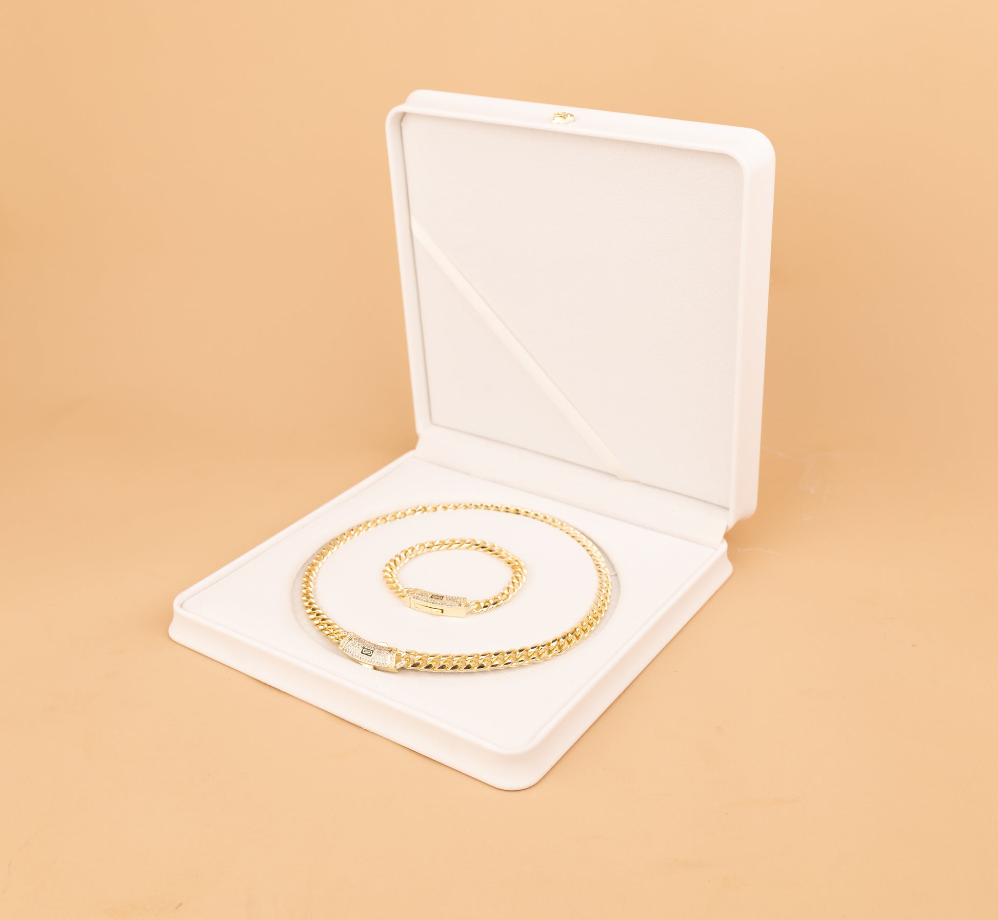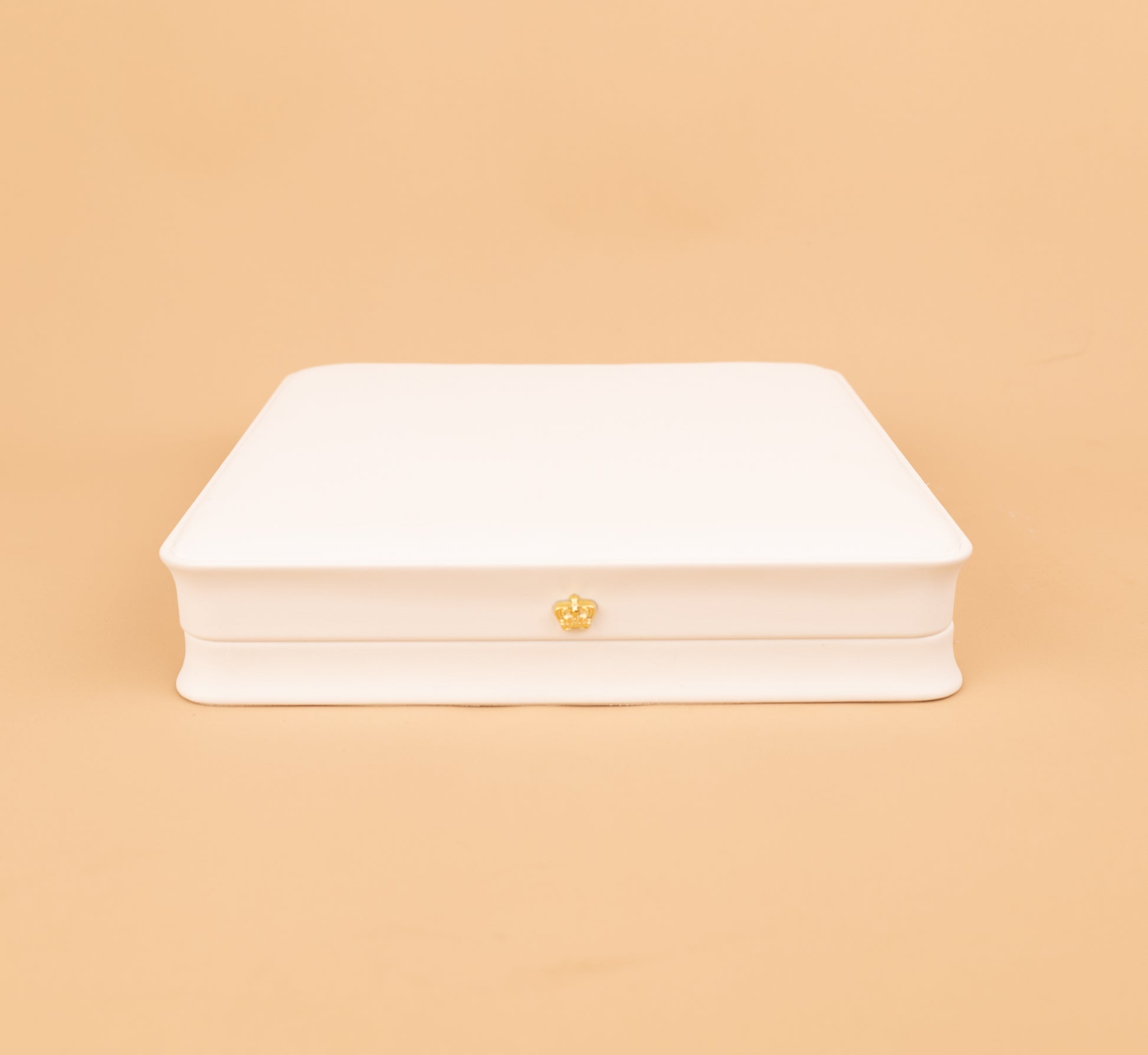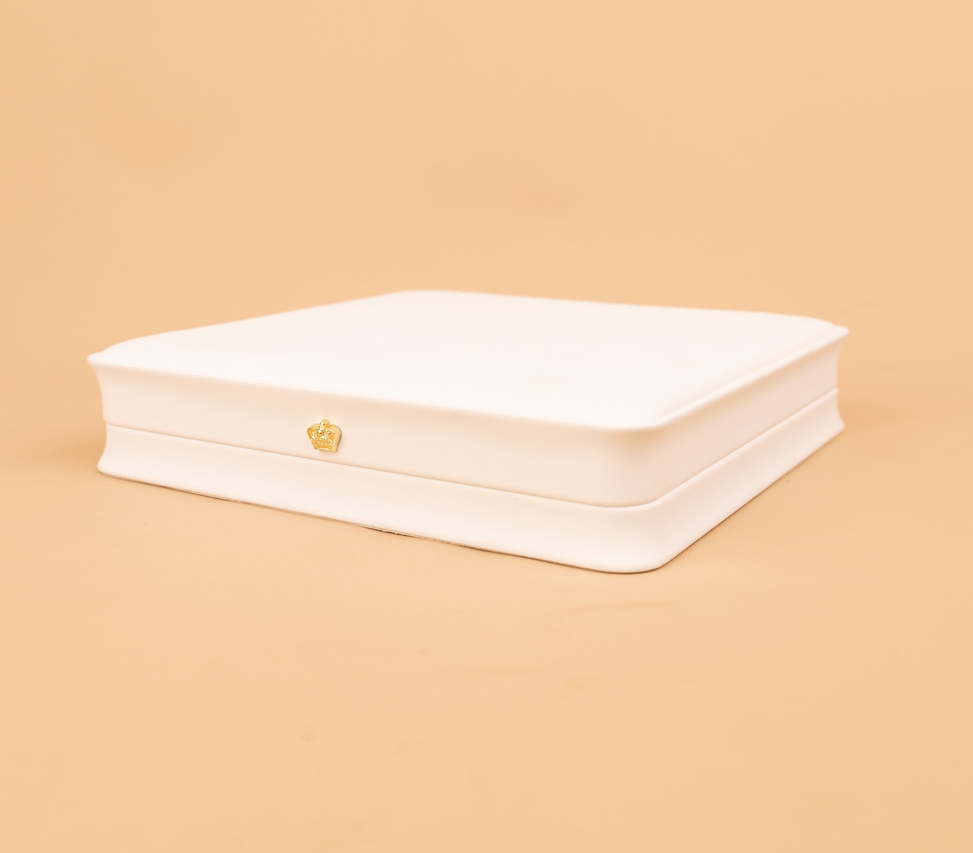 Caja elegante (no incluye cadena de la foto) con acabado tipo leather en color blanco, ideal para cadenas, pulseras o joyas alargadas. Interior acolchado suave que protege la pieza y realza su presentación.