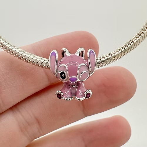Este encantador Dije inspirado en Angel, la inseparable compañera de Stitch, llega en un delicado tono rosa pastel con acabados en esmalte y detalles en plata 925. Con una expresión coqueta y un guiño irresistible, este diseño es el regalo perfecto para expresar ternura, amistad y estilo