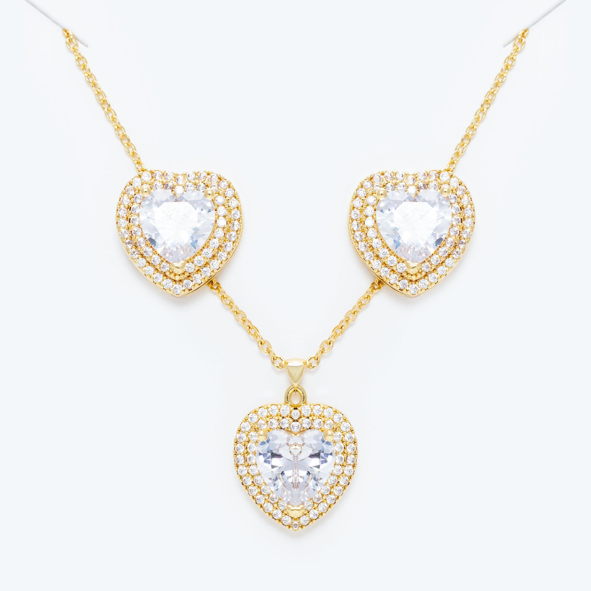 Set dorado con dijes en forma de corazón, decorados con circonitas y piedra central brillante. Incluye collar y aretes. Romántico, elegante y lleno de luz. Este set no tiene cambio ni garantía.