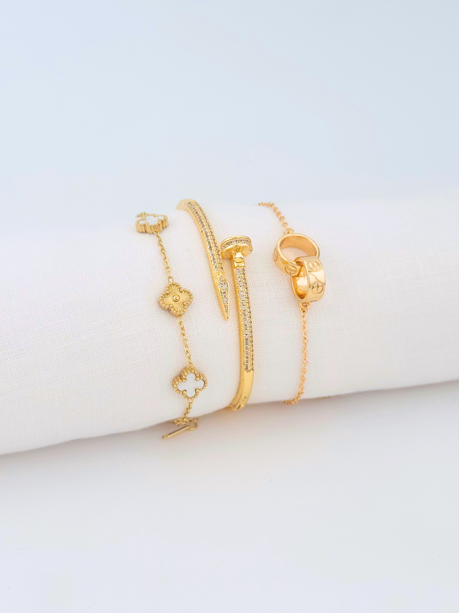 Juego Pulsera Arabe Dorada Clavo y Trebol Blanco PBA31