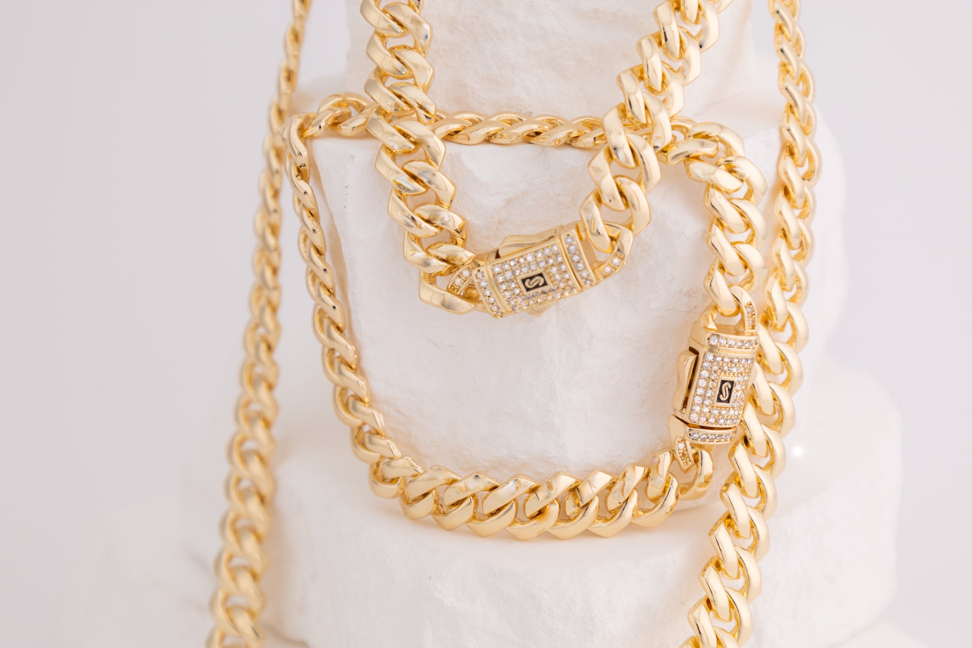 Kit Cadena y Pulsera en oro laminado de 14k y ancho 9mm, cadena 45 cm, Pulsera de 18 cm y 21 (sirve para talla 15 a 18 cm y de 15 a 21 cm)