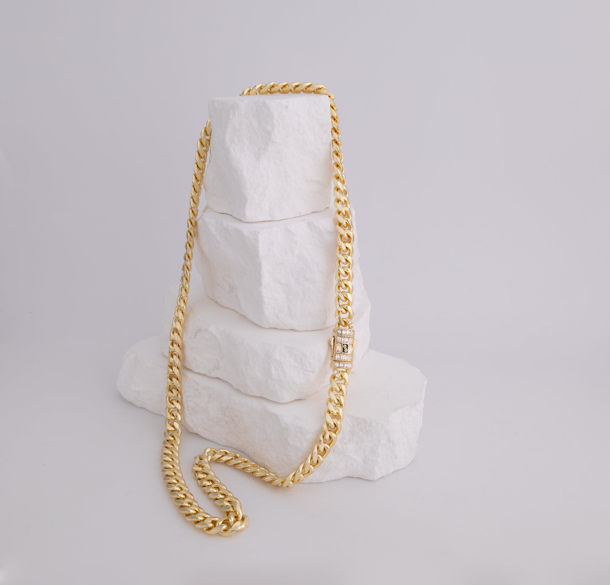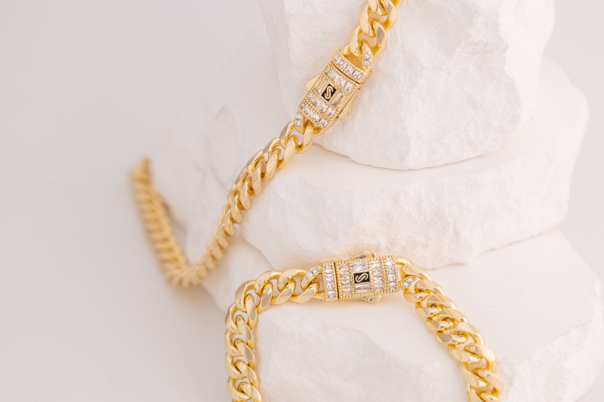 Kit Cadena y Pulsera en oro laminado de 14k y ancho de 9 mm, cadena 55 cm, Pulsera de 21 cm (sirve para talla 15 a 21 cm quitando los eslabones)