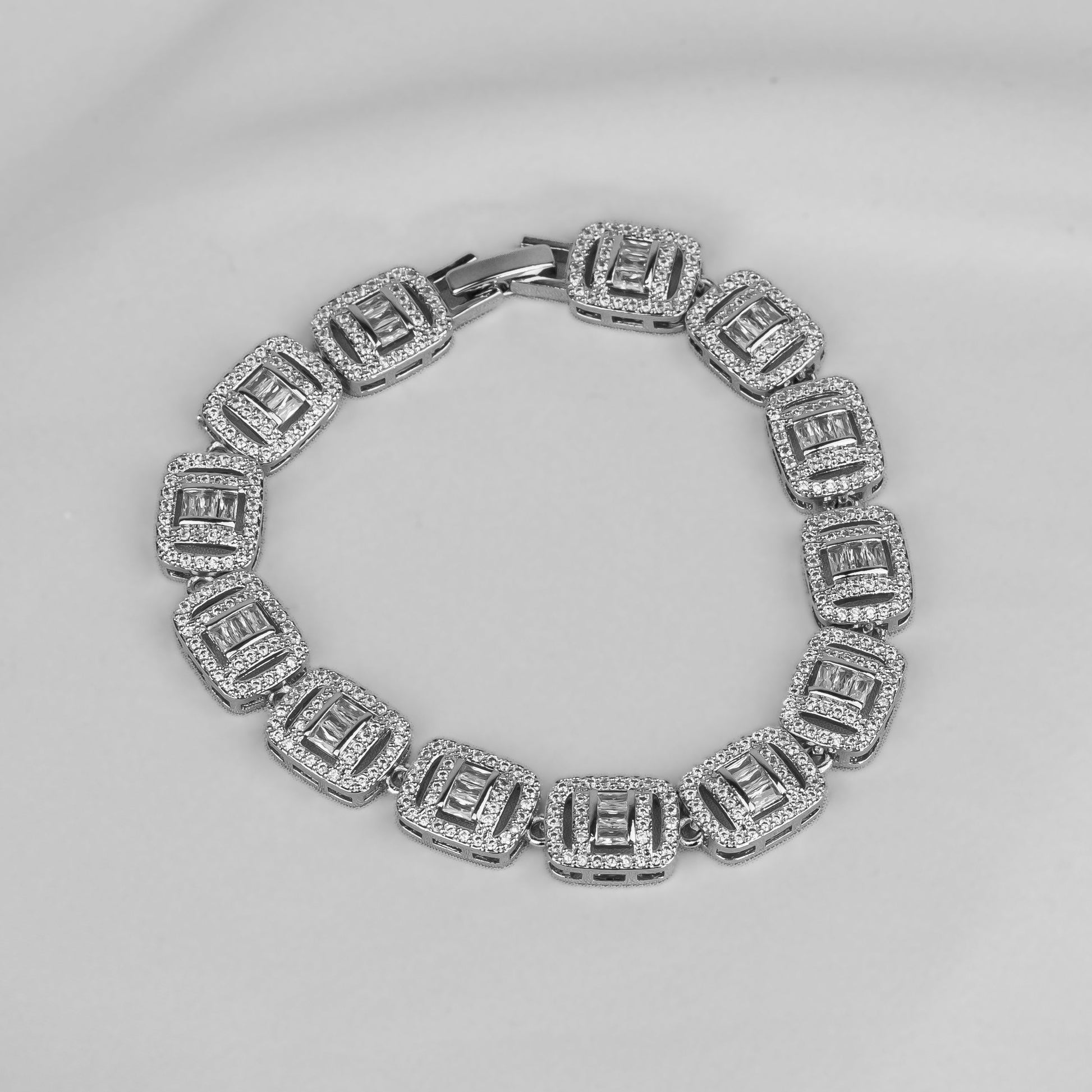 Esta pulsera cuenta con un diseño geométrico único, adornado con circonitas que le dan un toque de elegancia y lujo. Su mecanismo de cierre asegura un ajuste perfecto, haciendo de esta pulsera un accesorio refinado y sofisticado ideal para cualquier ocasión.