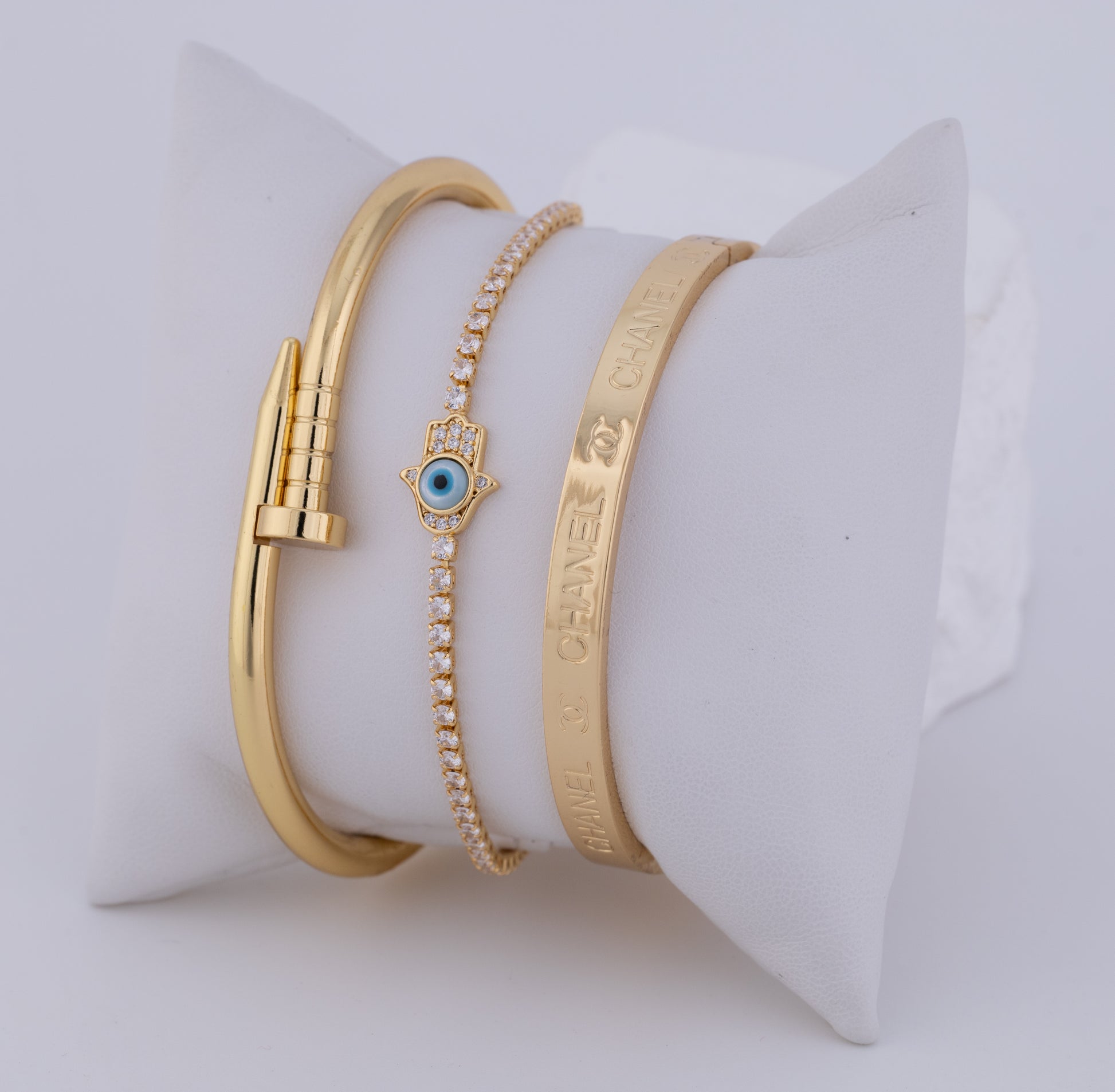 Set de tres pulseras que combina carácter y elegancia: pulsera tipo clavo de diseño firme, pulsera lisa de acabado espejo y pulsera tipo tenis con circones brillantes. Sirven para tallas 17,18 y 19