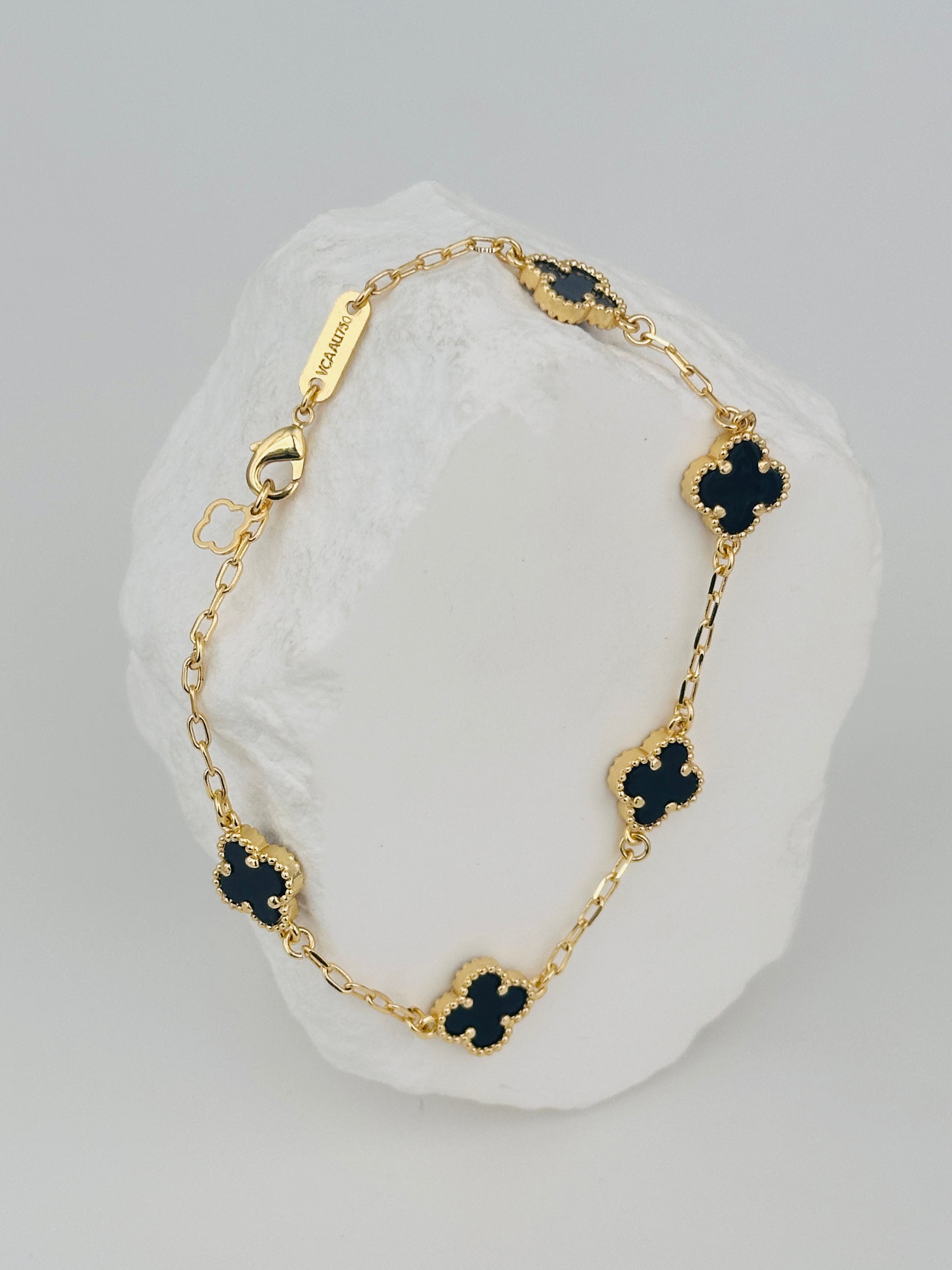 Pulsera en oro laminado con tréboles, ajustable de la talla 16 a la 20, El tamaño del trébol es de 11 milímetros aproximadamente