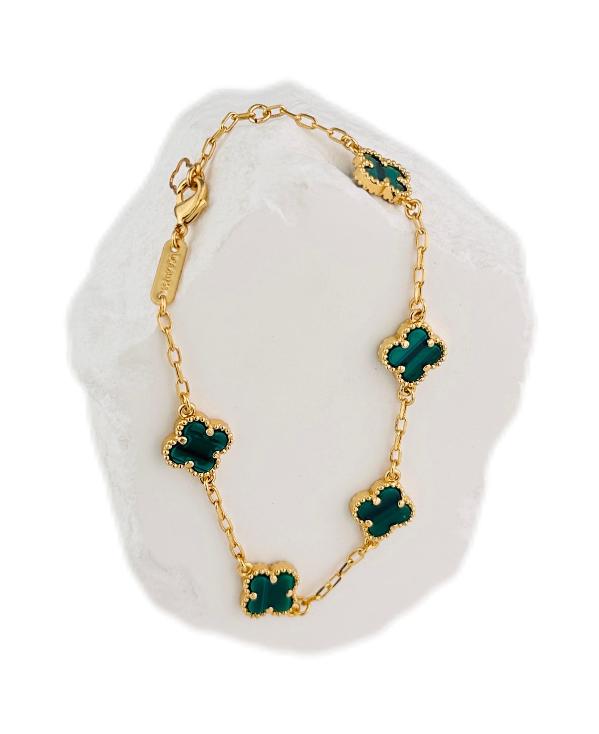 Pulsera en oro laminado con tréboles, ajustable de la talla 16 a la 20, El tamaño del trébol es de 11 milímetros aproximadamente