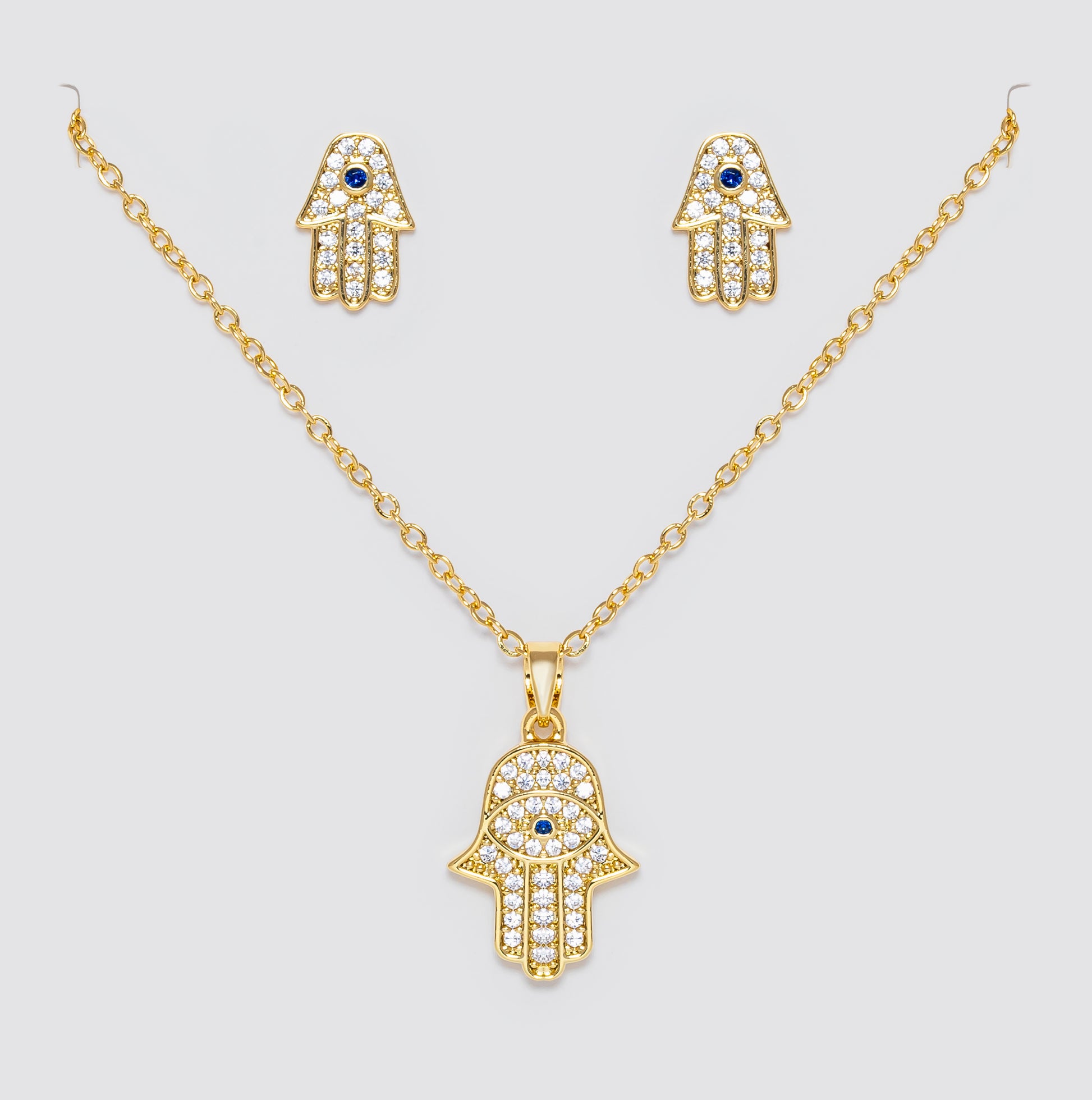 Set con dije y aretes de Mano de Fátima decorados con circonias y centro azul. Un amuleto de protección con brillo y estilo.