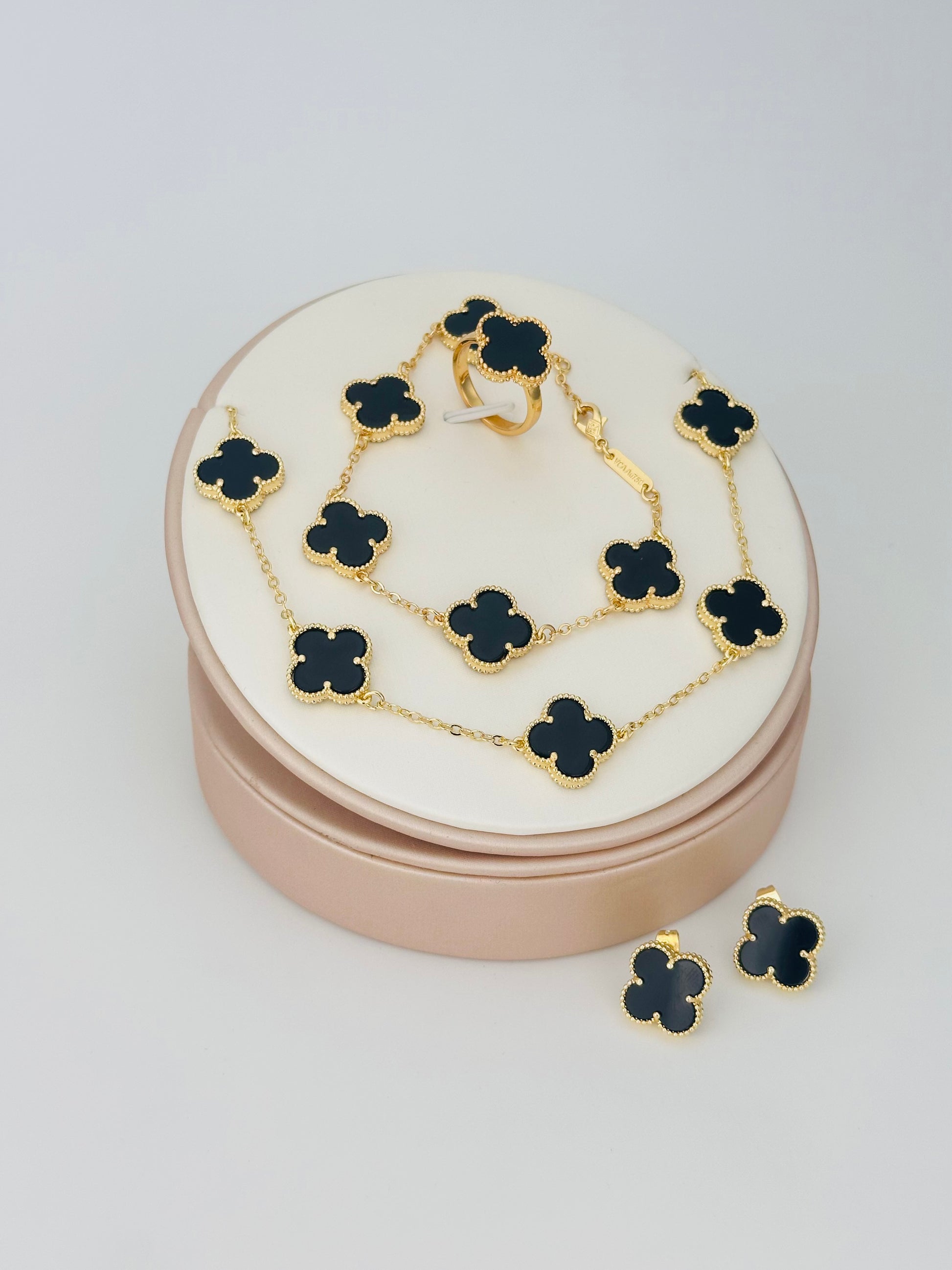Set de Collar, Pulsera, Aretes Grande y Anillo Negro Liso Trebol VCAP08