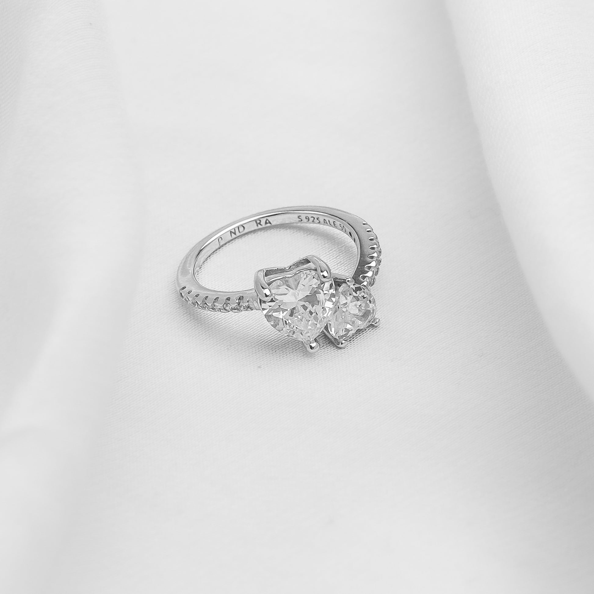 El amor se refleja en cada detalle de este anillo doble con corazones de cristal, ideal para regalar en momentos inolvidables o para expresar sentimientos profundos.