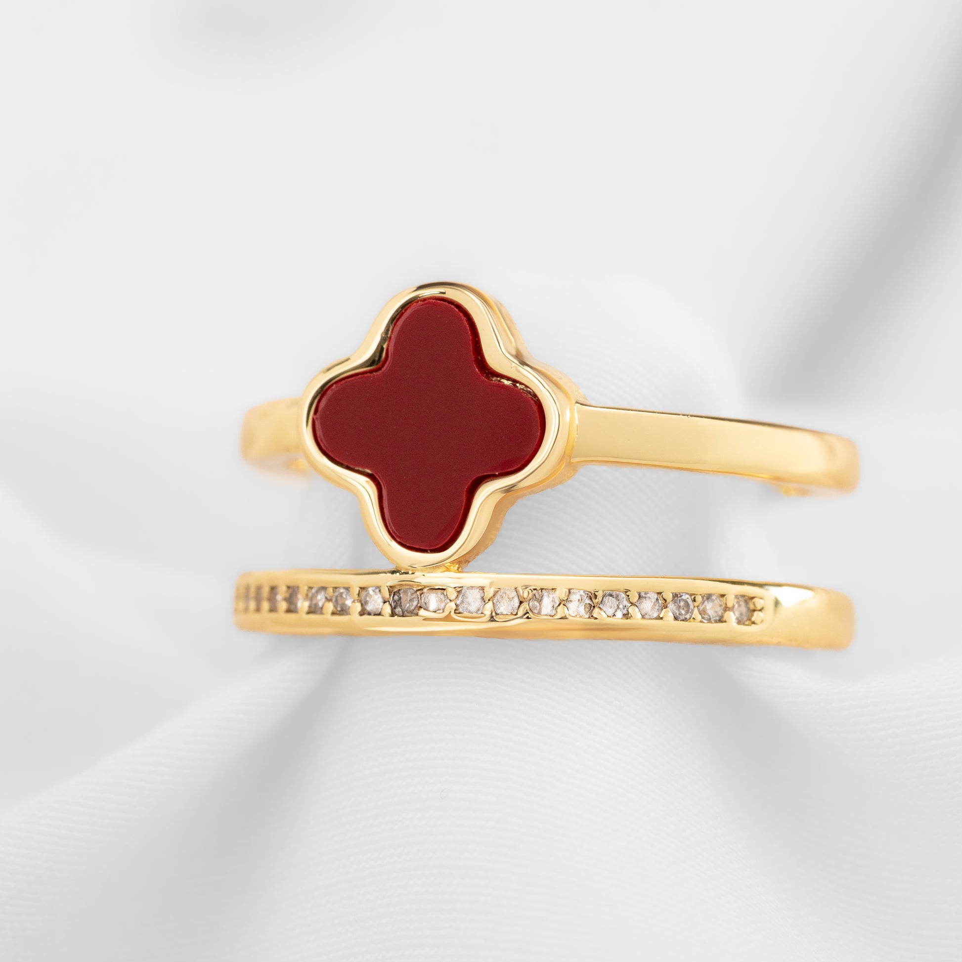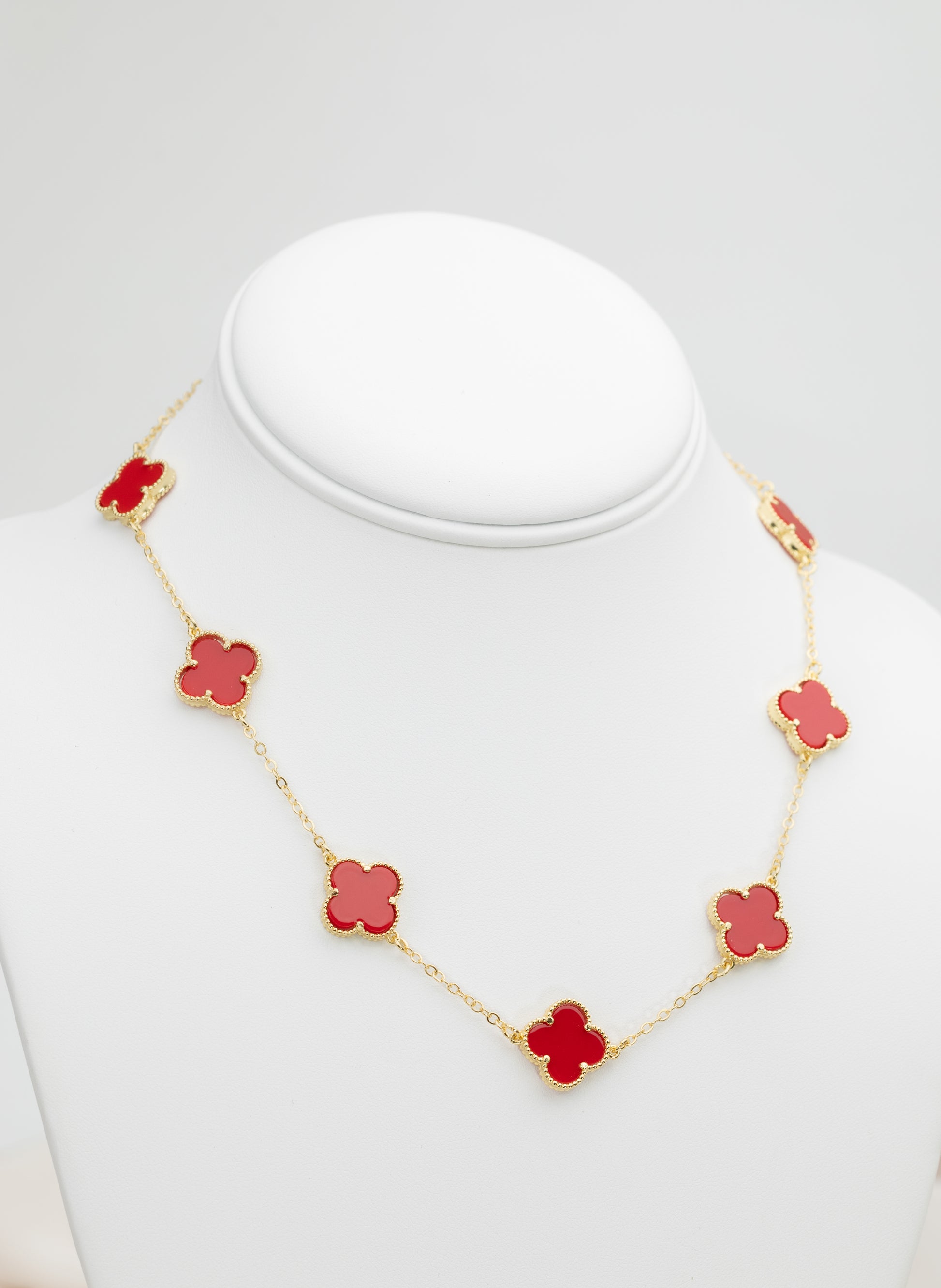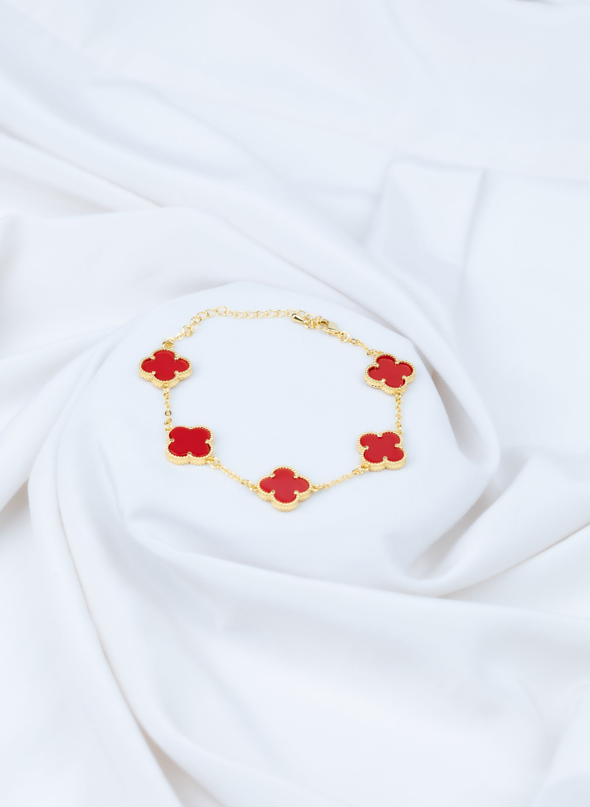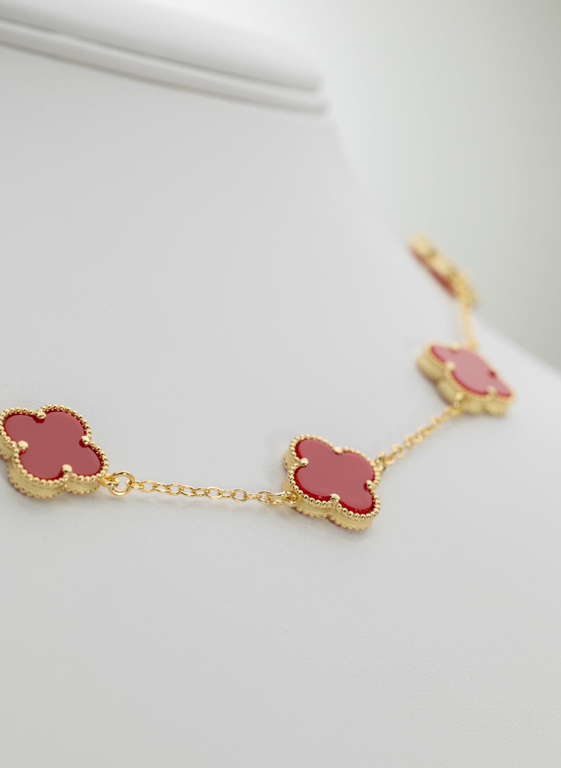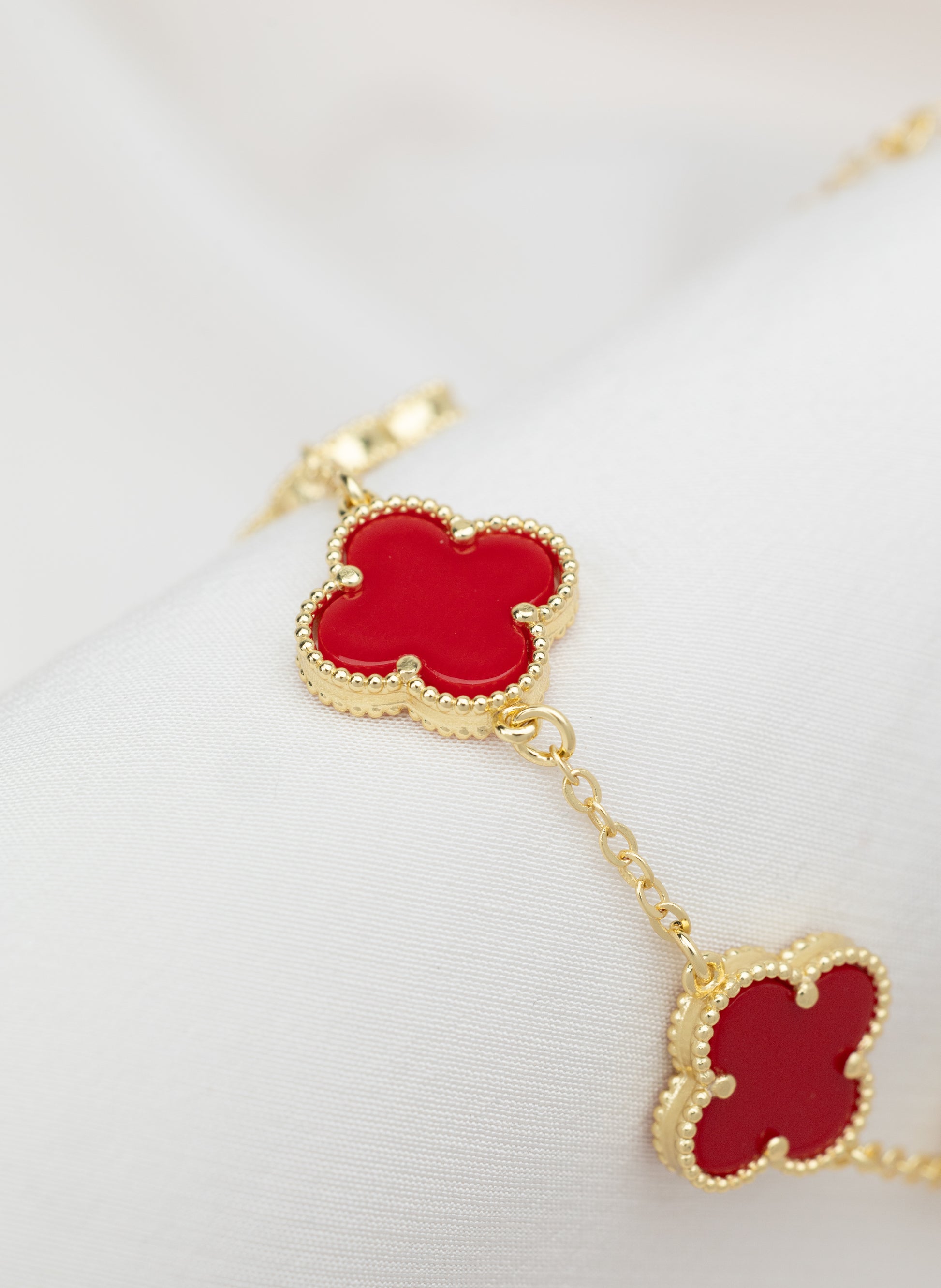 Este elegante set es el complemento perfecto para realzar tu estilo en cualquier ocasión. Incluye un delicado collar con aretes, una pulsera y un anillo, ambos diseñados con finos detalles en forma de trébol de cuatro hojas en color rojo y borde dorado. Ajustable desde la talla 16 a 23 cm (sirve para todas las tallas)