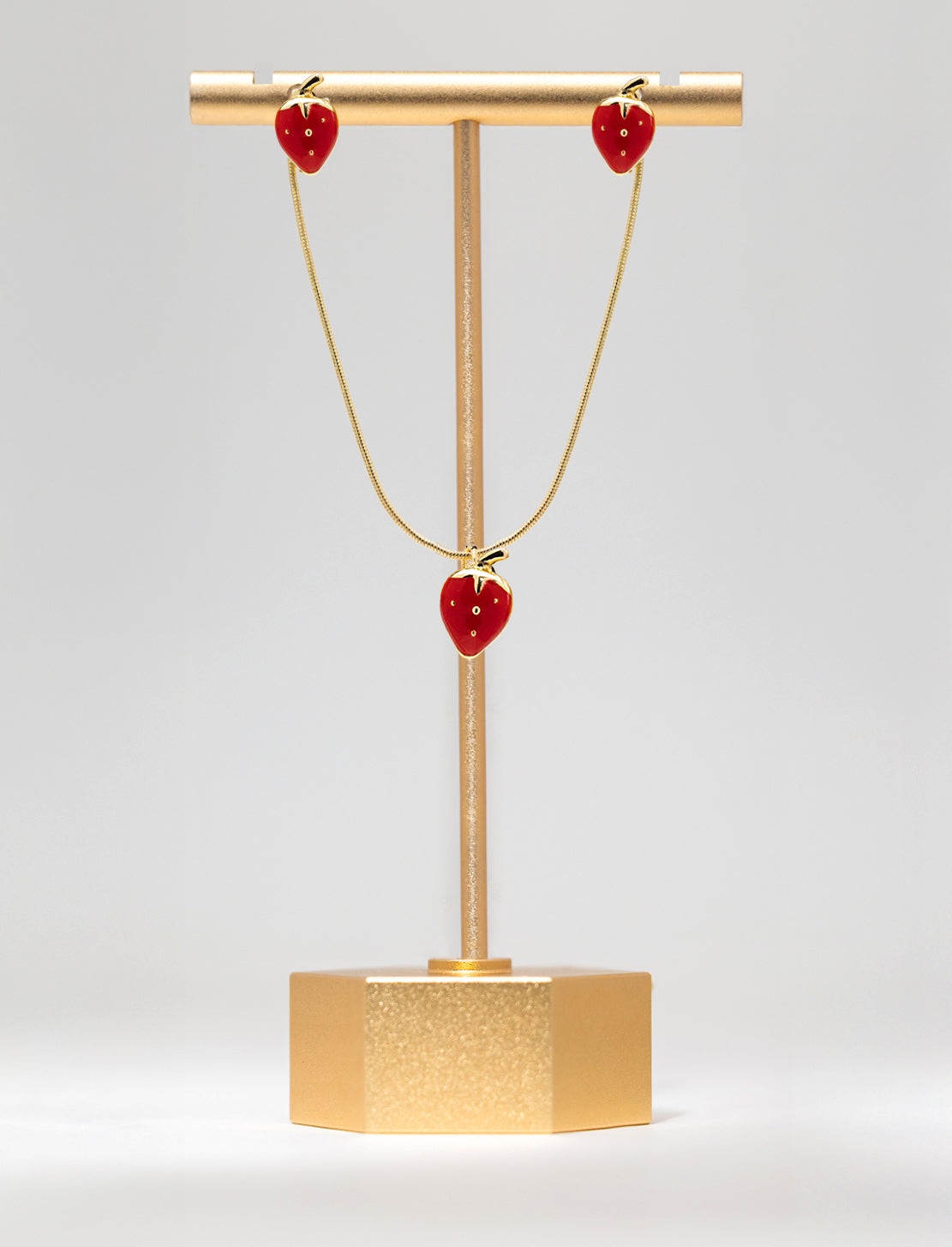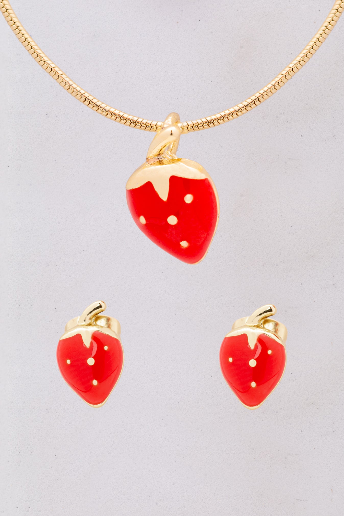 Celebra tu lado más dulce con este elegante set de cadena y aretes dorados, realzados con pequeños detalles de fresas esmaltadas en rojo intenso. El diseño circular y minimalista lo convierte en una joya versátil