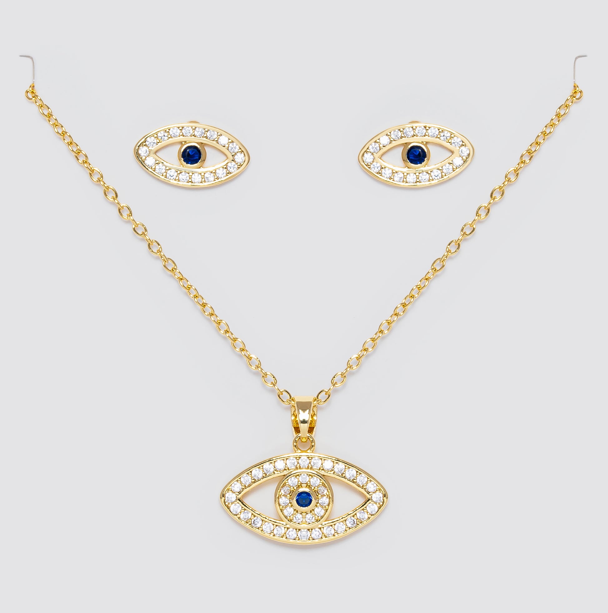 Set dorado con diseño de ojo turco decorado con circonias y centro azul. Incluye collar y aretes. Ideal para llevar protección con estilo.